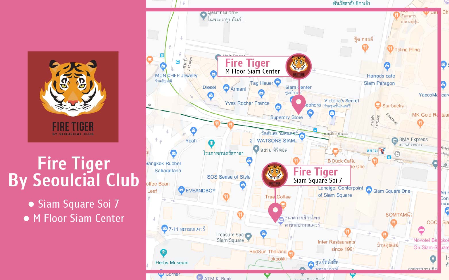 Fire Tiger จะมีสาขาแถวสยามด้วยกันทั้งหมด 2 สาขานั่นเอง สาขาแรกก็คือ สยามแสควร์ ซอย 7 และอีกสาขาอยู่บริเวณสยามเซ็นเตอร์ ชั้น M หรือบริเวณชั้นที่เชื่อมกับ BTS และ สยามพารากอน นั่นเอง