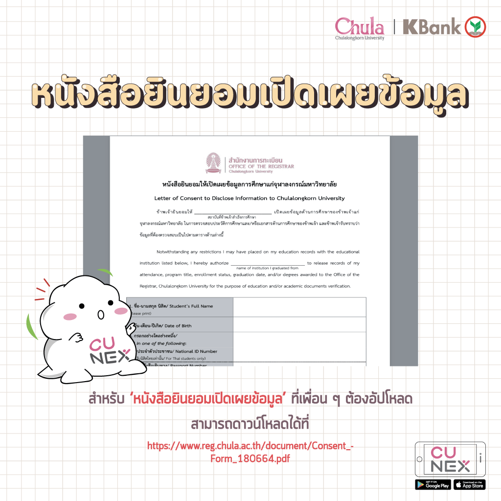 - สำหรับ ‘หนังสือยินยอมเปิดเผยข้อมูล’ ที่เพื่อน ๆ ต้องอัปโหลด สามารถดาวน์โหลดได้ที่ https://www.reg.chula.ac.th/document/Consent_Form_180664.pdf