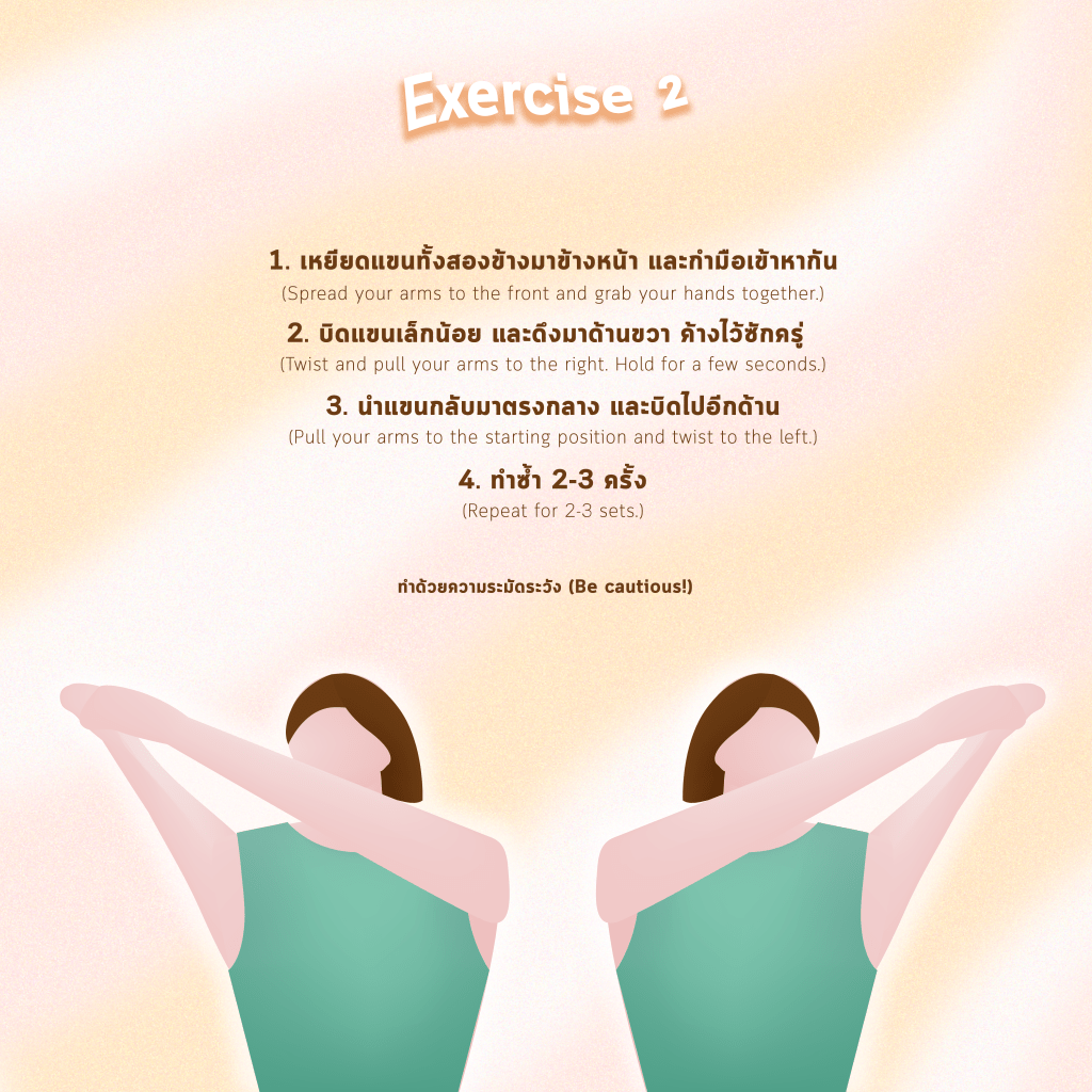 - Twist and pull your arms to the right. Hold for a few seconds.