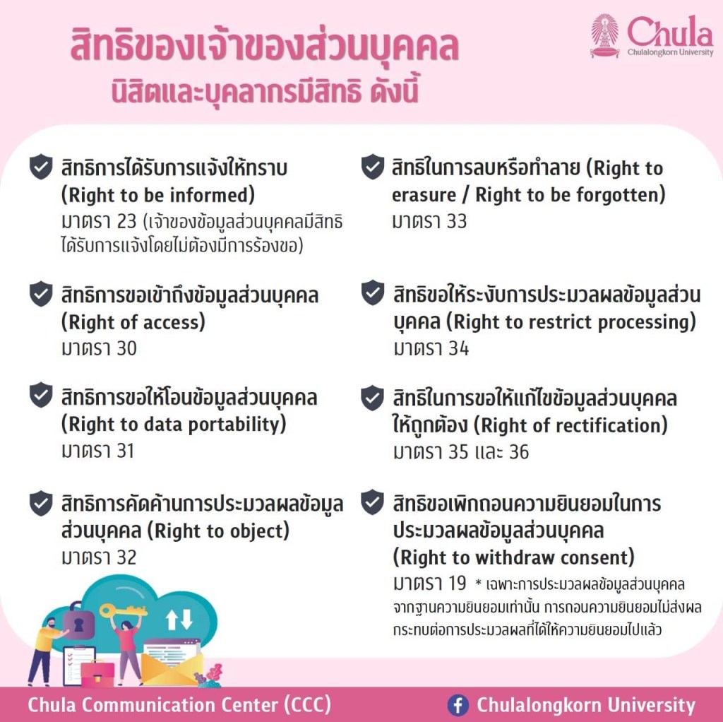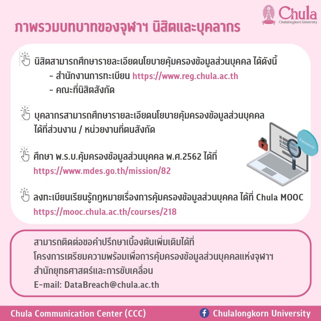 นิสิตและบุคลากรจุฬาฯ จึงจำเป็นต้องรู้เท่าทันกฎหมายฉบับนี้ เพื่อให้รอดพ้นจากการกระทำที่รู้เท่าไม่ถึงการณ์ ซึ่งอาจได้รับผลกระทบตามมาหากขาดความรู้เกี่ยวกับ พ.ร.บ. ฉบับนี้ มหาวิทยาลัยจึงได้สรุปข้อมูลที่นิสิตและบุคลากรควรรู้เกี่ยวกับการคุ้มครองข้อมูลส่วนบุคคล ดังนี้