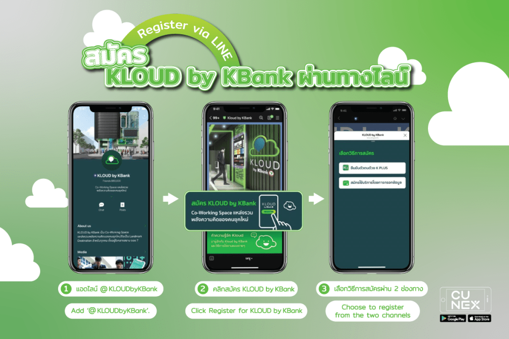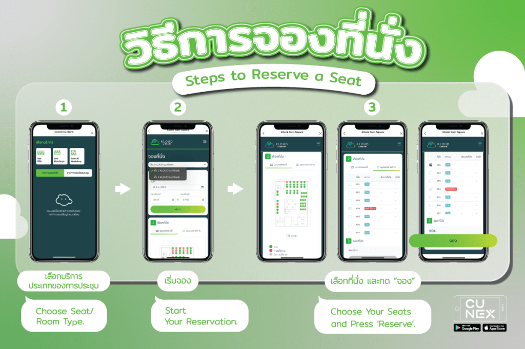 Unable to find a seat? KLOUD by KBank allows you to reserve your seats ahead of time via your mobile phone! Simply add the LINE Official Account @KLOUDbyKBank to view the seating plans and its availability on your preferred date of use! Simultaneously, you may also make reservations at the KLOUD by KBank building! 💚