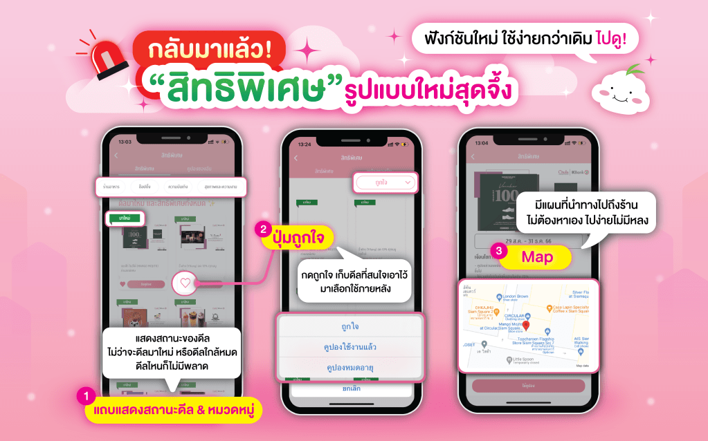 ✨และอันสุดท้ายไฉไลสุด คือ “map📍” ที่อยู่ร้านเด็ดเจ้าของดีลปัง ๆ สนใจดีลไหน กดคลิกเดียวก็มีผู้ช่วยนำทางไปยังร้านนั้นเลย ไม่ต้องกดหลายขั้นตอน