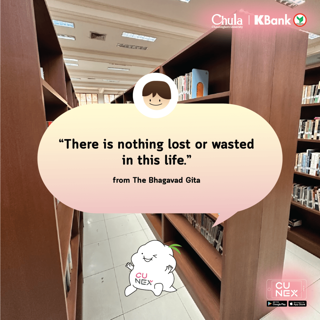 📚from The Bhagavad Gita (คําอธิบาย: “สิ่งที่ผ่านมาในชีวิตเรา ไม่มีสิ่งใดที่ไร้ค่าหรือสูญเปล่า ทุกอย่างที่ผ่านเข้ามาในชีวิตล้วนเป็นบทเรียน”)