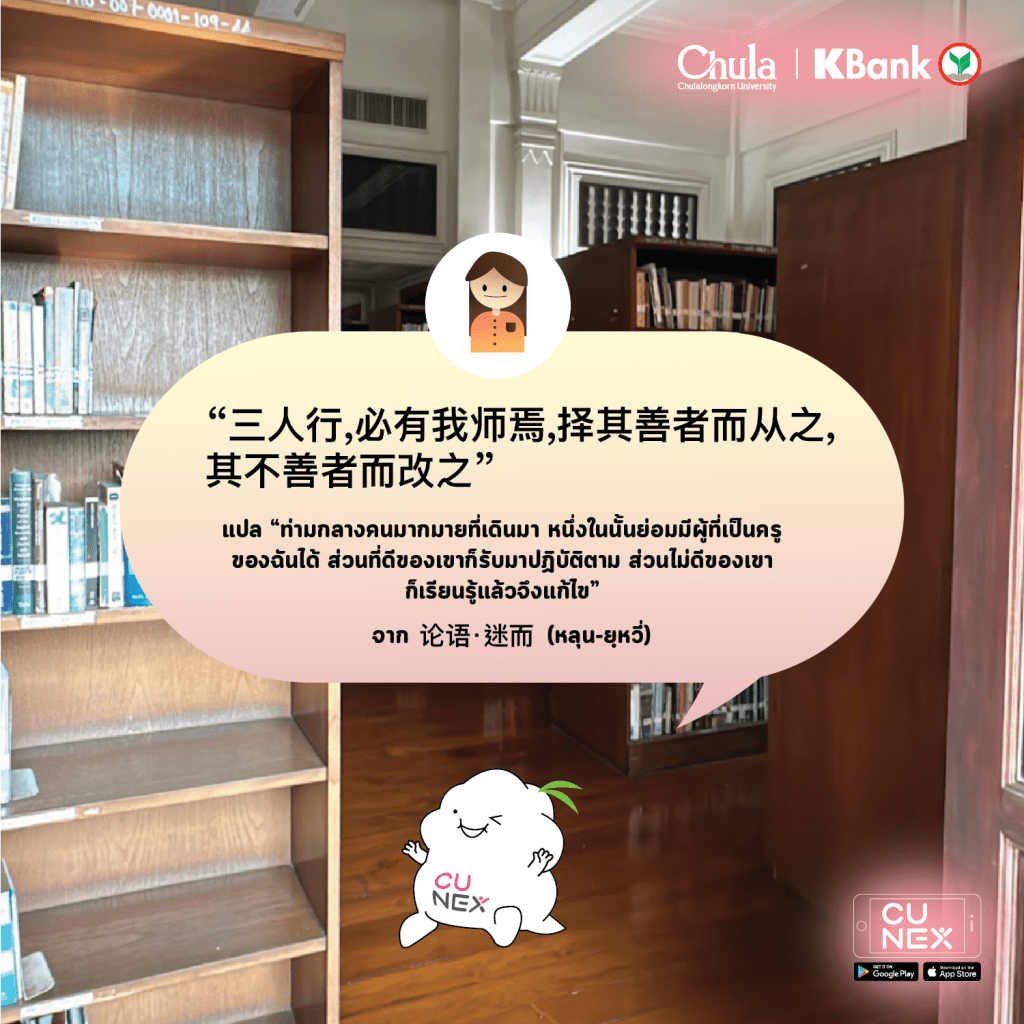 📚จาก 《论语·迷而》 (หลุน-ยฺหวี่) (คําอธิบาย: “ทุกคนต่างมีข้อดีของตัวเองพยายามเลือกรับและปรับใช้ข้อดีของผู้คนเพื่อนํามาพัฒนาตัวเอง”)