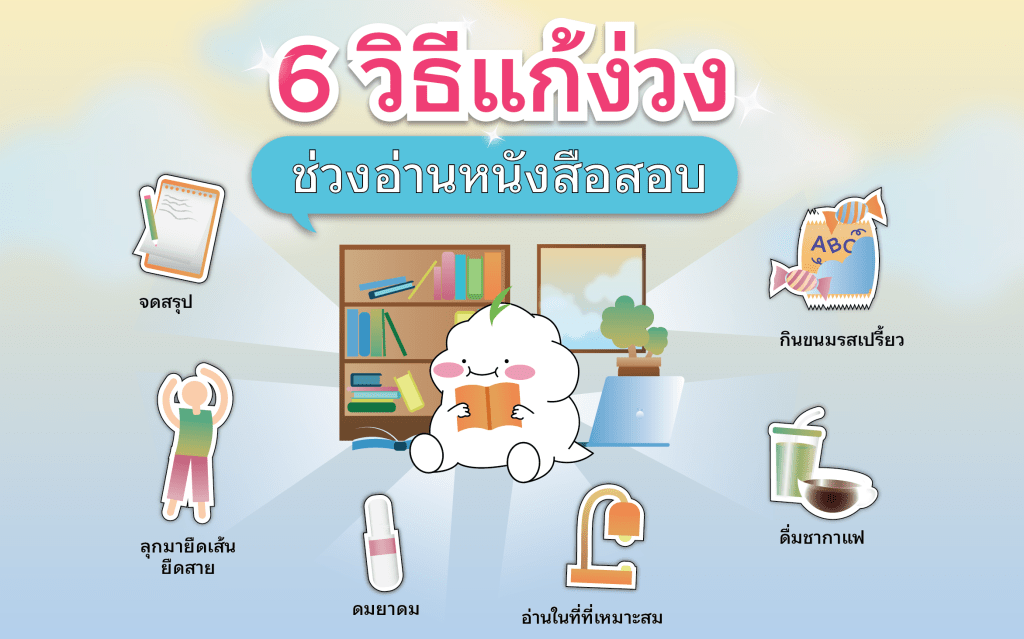 ลุกขึ้นมาขยับตัวยืดเส้นยืดสาย ประมาณ 5-10 นาที อย่างน้อยชั่วโมงละ 1 ครั้ง เพื่อทำให้ร่างกายตื่นตัวพร้อมรับข้อมูลใหม่ ๆ อีกครั้ง วิธีนี้ยังช่วยลดอาการปวดเมื่อยจากการนั่งอ่านหนังสือนาน ๆ อีกด้วย