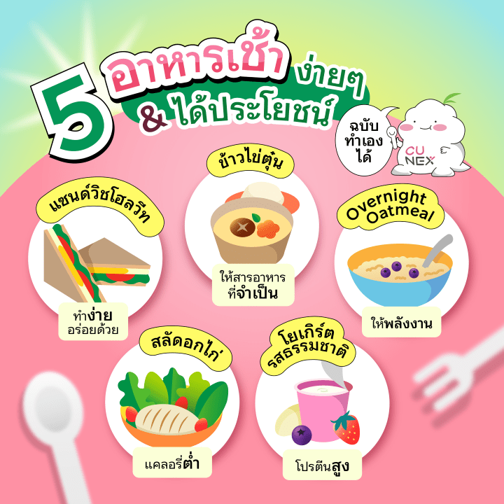 นอกจากจะเป็นการเริ่มต้นวันที่ดีแล้ว การเลือกทานอาหารเช้าที่ถูกต้องจะช่วยควบคุมน้ำหนัก ไม่ทำให้หิวระหว่างวัน และสิ่งที่สำคัญที่สุดนั่นคือการทานอาหารให้ครบ 5 หมู่ในทุกมื้อ 💪🏻