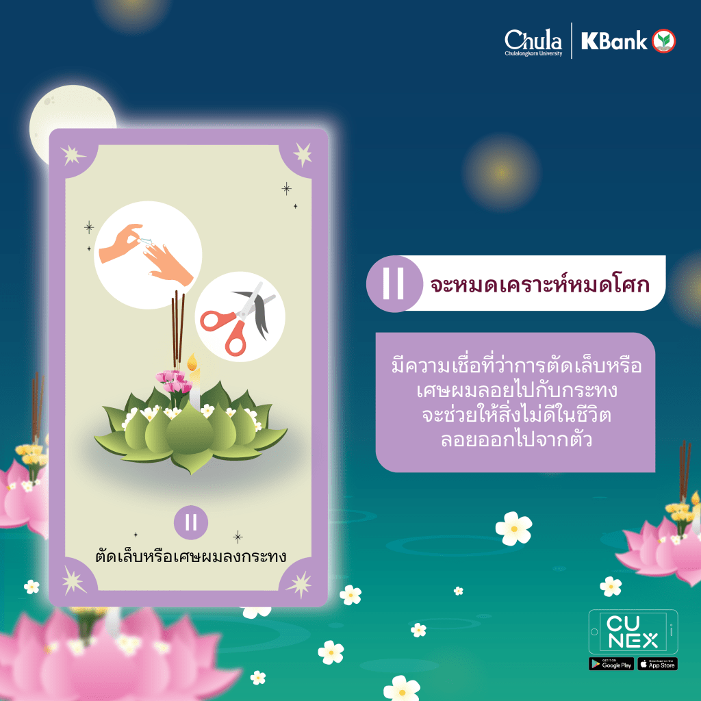มีความเชื่อที่ว่าการตัดเล็บหรือเศษผมลอยไปกับกระทงจะช่วยให้สิ่งไม่ดีในชีวิตลอยออกจากตัว