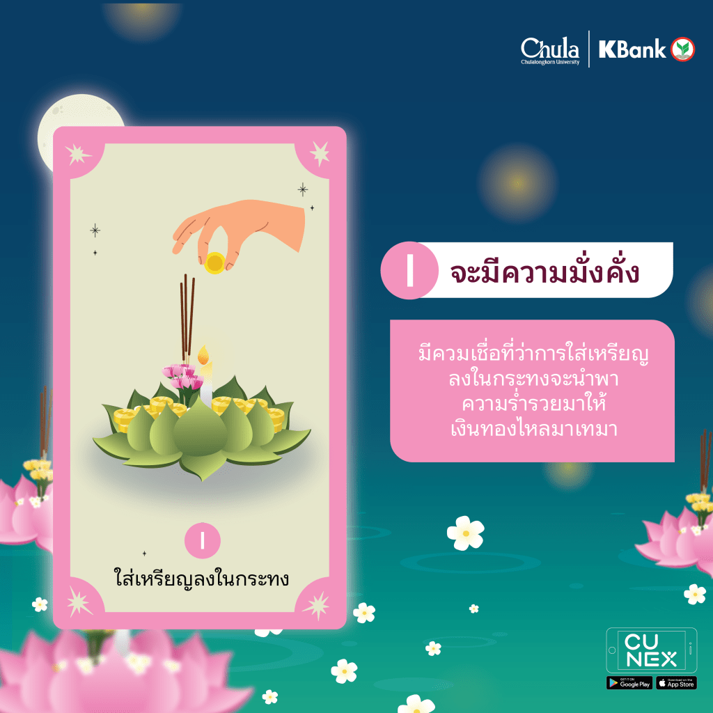 มีความเชื่อที่ว่าการใส่เหรียญลงกระทงจะนำพาความร่ำรวยมาให้ เงินทองไหลมาเทมา