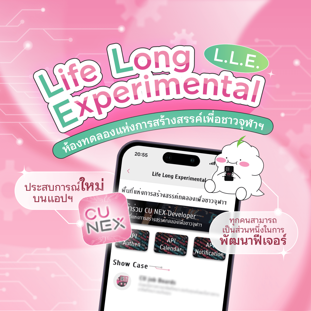 ✨เปิดประสบการณ์ใหม่ของชาวจุฬาฯ ❗️ เพื่อน ๆ รู้กันหรือยังว่าตอนนี้ แอปฯ CU NEX ได้มีฟีเจอร์น้องใหม่นั่นก็คือ “Life Long Experimental” หรือที่เรียกสั้น ๆ ว่า “L.L.E.” 📱ฟีเจอร์นี้เปรียบเสมือนห้องทดลองที่มีขึ้นเพื่อตามหานิสิตนักพัฒนามาเข้าร่วมเป็นส่วนหนึ่งของ CU NEX Developer ในการสร้างสรรค์ผลงานบนแอปพลิเคชัน