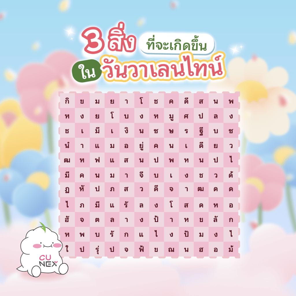 ใกล้จะถึงวันวาเลนไทน์แล้ว วันนี้น้อง NEXKY มีเกมมาให้เพื่อน ๆ เล่นกันนั่นก็คือออ Crossword 3 สิ่งที่จะเกิดขึ้นในวันวาเลนไทน์นี้ วิธีการเล่นก็ง่ายมาก ๆ เพียงแค่มองหาคำที่มีความหมายในตาราง 3 คำแรกที่มองเห็น คือสิ่งที่จะเกิดขึ้นในวันวาเลนไทน์นี้นั่นเองงง