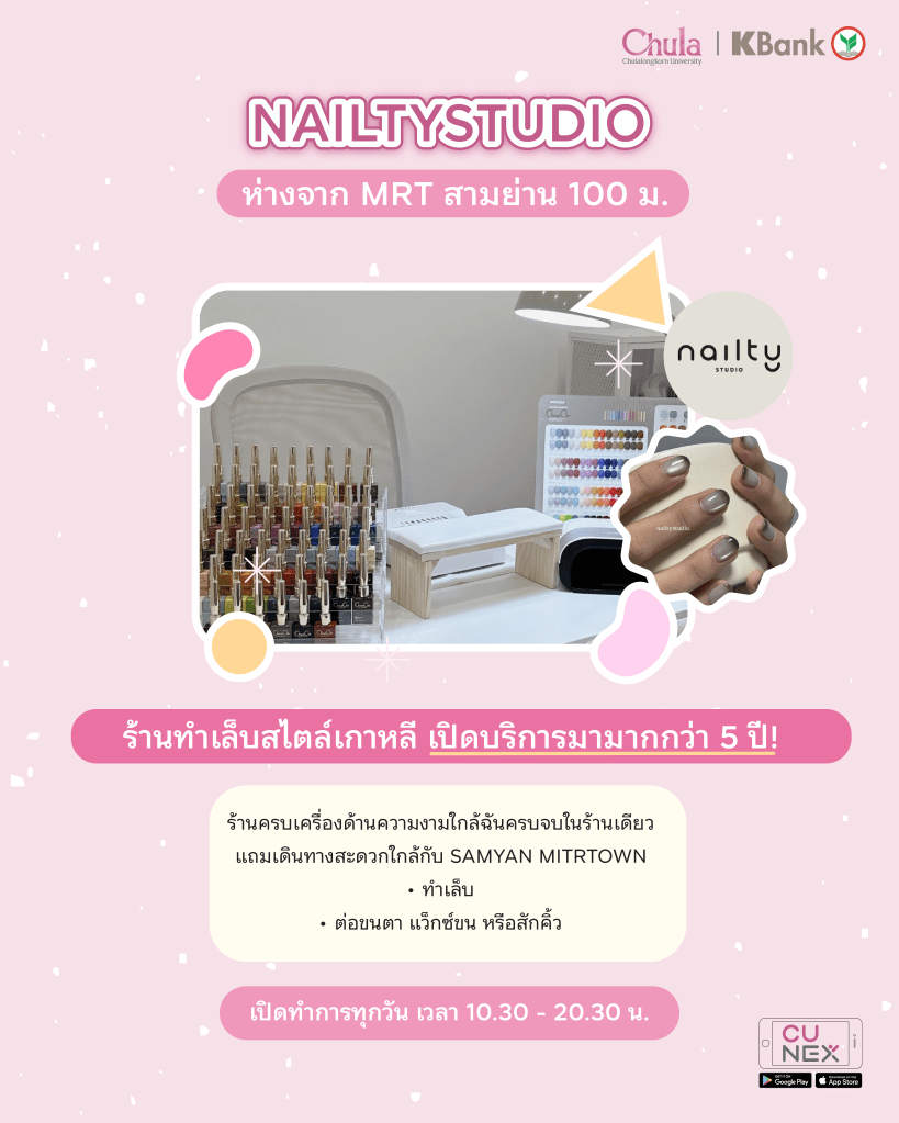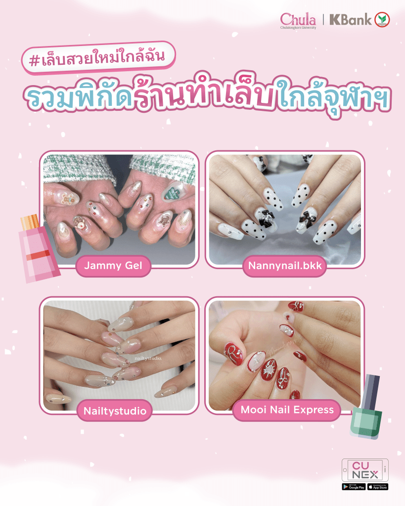 ใครสายเสริมความงามมาทางนี้ 💐 วันนี้ NEXKY รวบรวมพิกัดร้านทำเล็บสุดปังใกล้รั้วจุฬาฯ มาให้แล้ว ไม่ว่าจะสายเล็บเจล ต่อขนตา หรือสปามือเท้า บอกเลยว่าที่นี่มีครบ 💅 พร้อมแจกพิกัดส่วนลดบริการทำเล็บในแอปฯ CU NEX! จะมีที่ไหนกันบ้างไปดูกันเลย 💨🤸