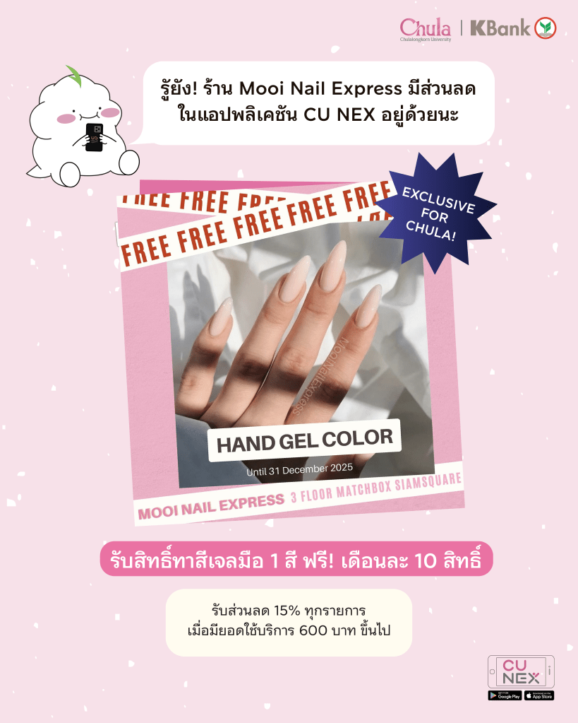 💎 พิเศษสำหรับชาวจุฬาฯ ที่ใช้บริการที่ร้าน Mooi Nail Express 💕 รับสิทธิ์ทาสีเจลมือ 1 สี ฟรี! เดือนละ 10 สิทธิ์ และ ส่วนลด 15% ทุกรายการเมื่อมียอดใช้บริการ 600 บาท ขึ้นไป 💢💅สามารถกดรับสิทธิพิเศษและอ่านเงื่อนไขการใช้งานได้ในแอปพลิเคชัน CU NEX เท่านั้นน 💟