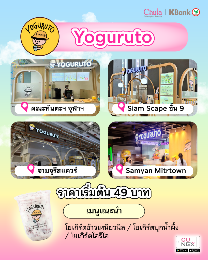เมนูแนะนำ : โยเกิร์ตข้าวเหนียวนิล / โยเกิร์ตบุกน้ำผึ้ง / โยเกิร์ตโอรีโอ