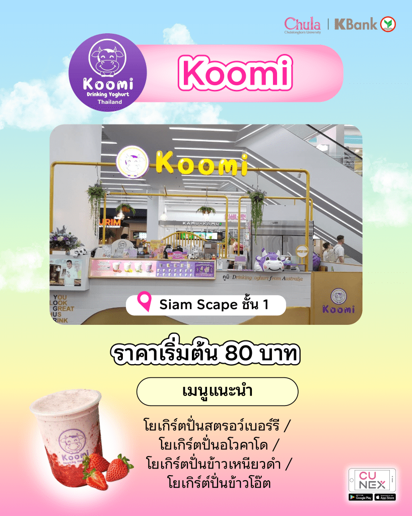 เมนูแนะนำ : โยเกิร์ตปั่นสตรอว์เบอร์รี / โยเกิร์ตปั่นอโวคาโด / โยเกิร์ตปั่นข้าวเหนียวดำ / โยเกิร์ต์ปั่นข้าวโอ๊ต