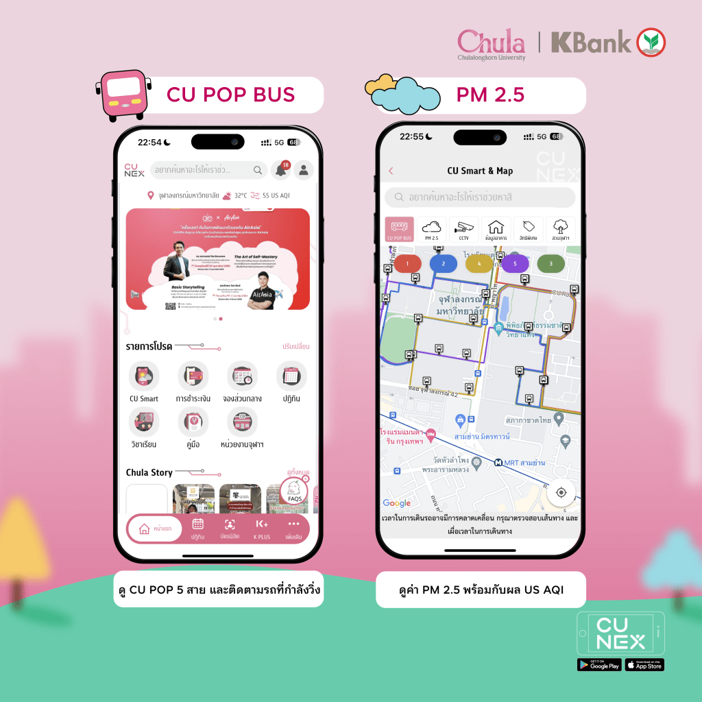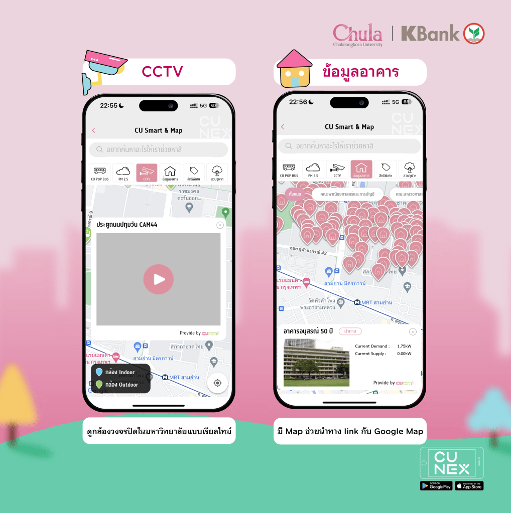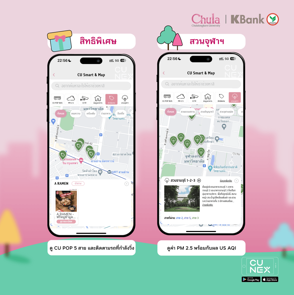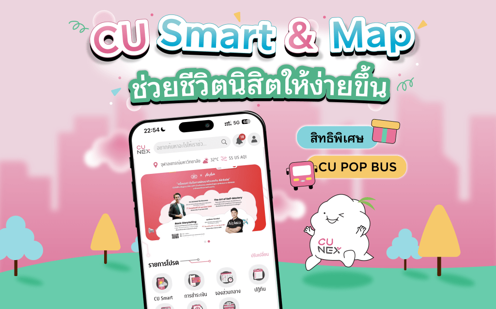The new CU NEX is here! with a new design, it’s more unique than ever. To make campus life even easier, let us introduce CU Smart & Map. With CU Smart & Map, you can track CU Pop Bus routes in real time, check PM 2.5 air quality levels, monitor campus safety with real-time CCTV, locate buildings, find parks to relax in and explore exclusive campus privileges.